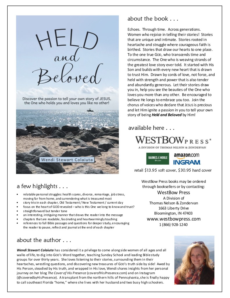 After sensing the LORD’s call to “tuck away” with Him for over a year, a surprising thought at the beginning of 2019 declared this year a time of “slow emerging.” It may very well have been slow, but His plans were not small. I never imagined the LORD would give me words to write a book that encapsulates pivotal moments of my whole life alongside accounts of women in His Word, realizing that we all tell a wondrous story of being Held and Beloved by Him!