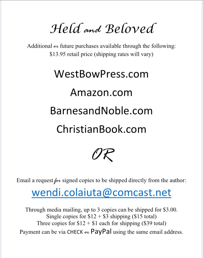 We will be reading Held and Beloved together (one chapter each week) and chatting about the Bible study questions at the end of each chapter. The Bible passages for each week’s study are included in the book, but will be echoed in the online study posts too. If you don’t have a copy of Held and Beloved yet, see below for ways to order one so you can read along!