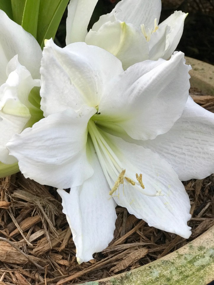 Two days after Resurrection Sunday I noticed this sweet surprise in our front flower bed. From a Christmas white amaryllis bulb we had potted several years ago, hoping it might bloom again. I’ll be honest. I had given up hope! But here it is this week, bursting with blooms!!! In brilliant white!
