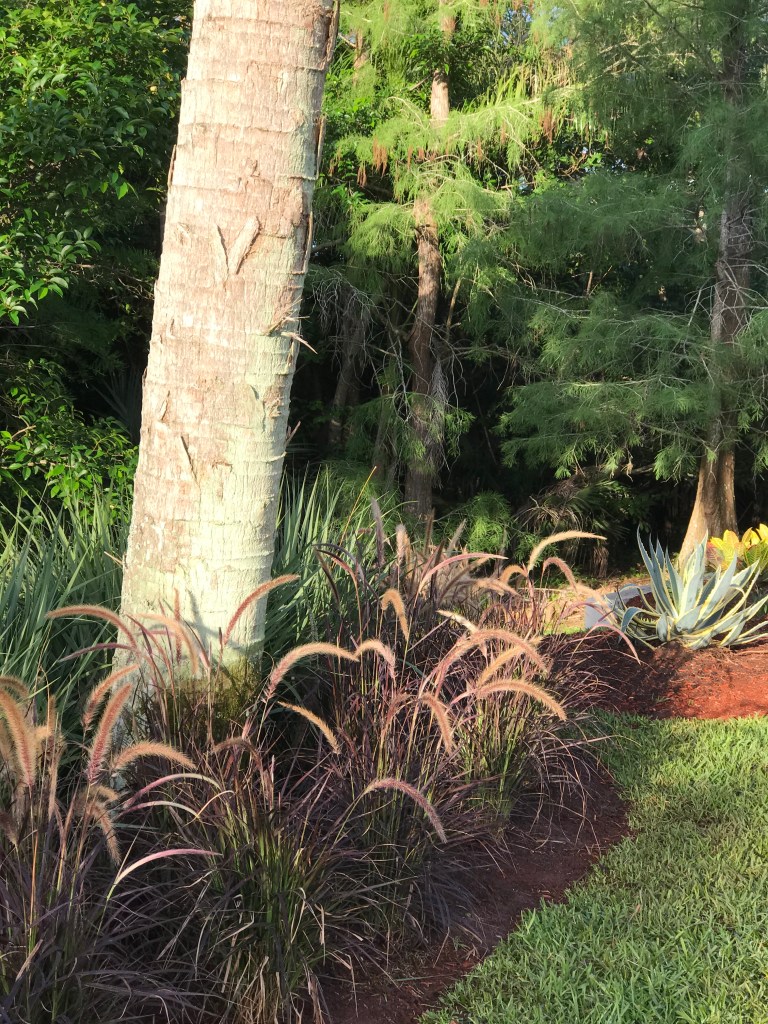 My transplanted northern self immediately imagined that little pine tree gracing the corner of a cozy cabin on a mountainside! But I know those are southern grasses catching the glint of the rising sun, beautifully placed at the foot of queen palm trees! Far from any mountainside.