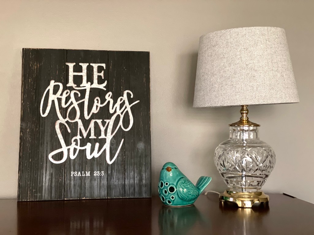 I kinda love that the lampshade is crooked. Had I noticed, I would’ve felt compelled to straighten it and retake the photo! … But this says to me that even when I’m off kilter, not myself, not perfect by any stretch, my Shepherd still draws near and restores my soul.