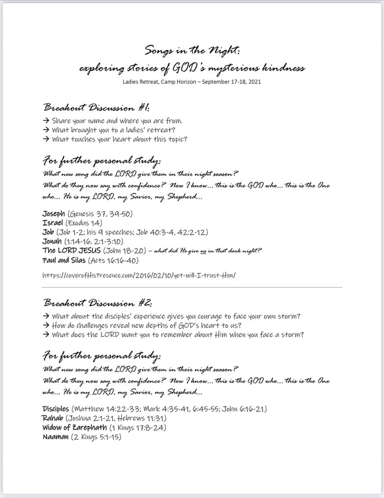 The amazing staff at Camp Horizon has posted audio recordings from our time together (see link below). On their website, in the blue box, click “2021 Ladies Retreat,” then select any one of the sessions or special music recordings.